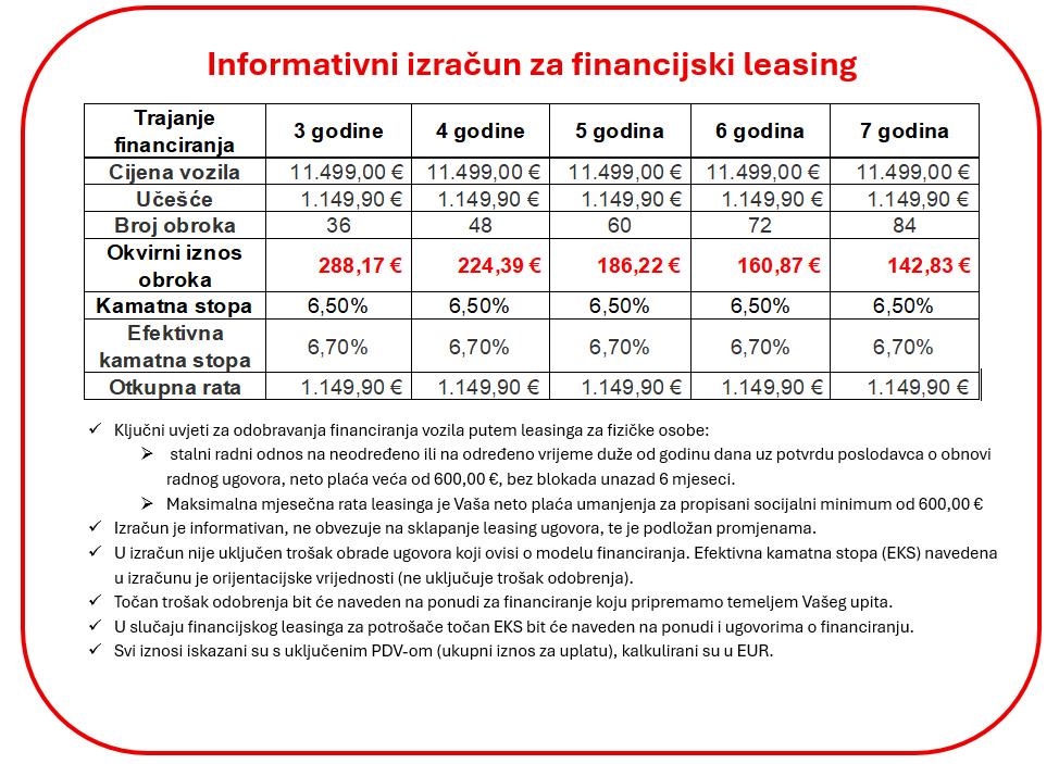 - Leasing (mogućnost leasinga bez učešća) - informativni izračun za predmetno vozilo pogledati u fotografijama