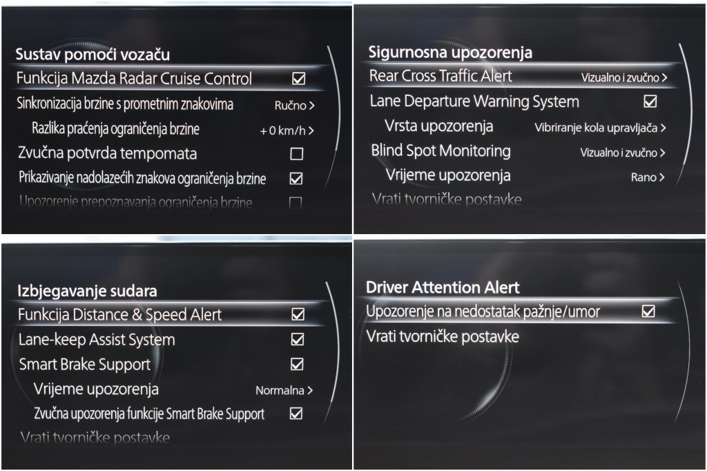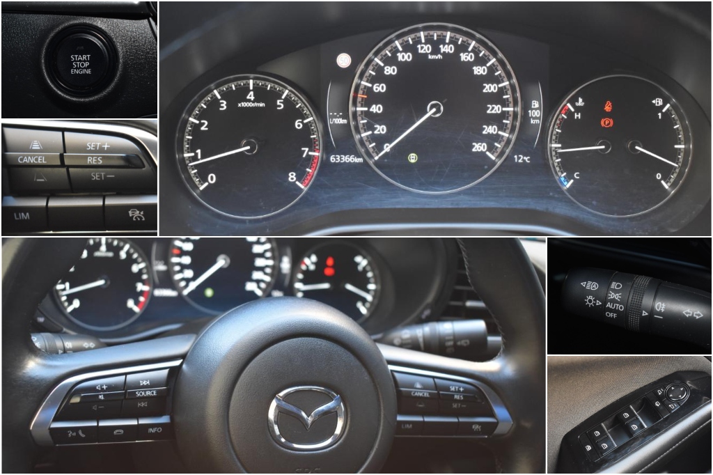 Boja:Crna metallic, klima, daljinsko zaključavanje, ESP, ASR, ABS, EBA, 6x airbag’s, servo, 4x el. podizači stakala,el.ručna kočnica+hill-hold, audio sustav DAB, USB priključak, bluetooth priključak za telefon, senzor za kišu,sjedala stoff sivi,crno nebo,kožni volan,multifunkcijske tipke na volanu, indikator smanjenog pritiska u pneumaticima, ISOFIX učvršćivač za dječje sjedalo, sklopivo stražnje sjedalo, dvodjelno 60/40, ukrasni detalji unutrašnjosti od aluminija, multifunkcijske tipke na volanu, navigacija, putno računalo,Mazda Radar ,Adaptivni tempomat i ograničavač brzine,prikazivanje nadolazećih znakova ograničenja brzine,parking senzori ,kamera za parkiranje, ECO Start & Stop, Navigacija,Front Assist – pomoć pri kočenju ukoliko sustav uoči kasnu reakciju,Lane Assist-pomoć pri držanju trake, keyless go-paljenje na tipku, automatsko paljenje dugih i kratkih svjetala,Automatsko gašenje svjetala,head up display,VIRTUAL Cockpit, Ručni Mjenjač 6 brzina,Prime-Line oprema, Novi model,2.0 Benzin MildHybrid-90 kW