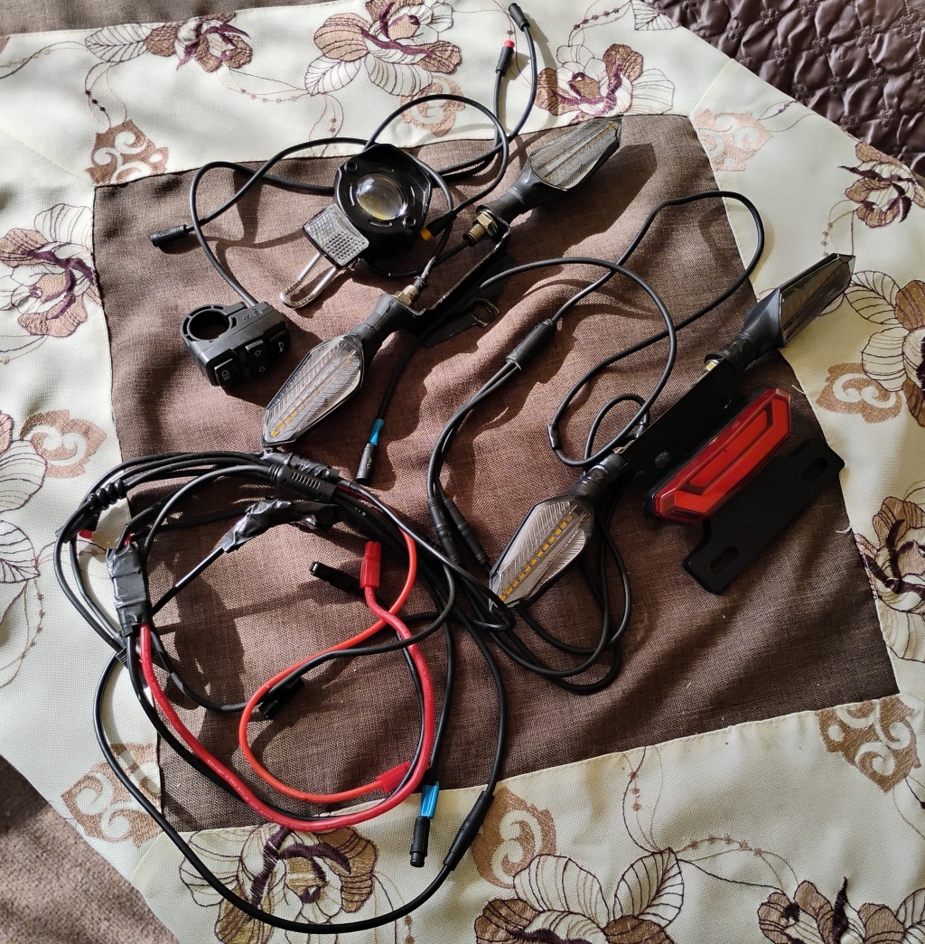Prodajem komplet svjetala za električne bicikle. Sastoji se od jakog prednjeg i zadnjeg svjetla i 4 žmigavca i kontrole kojom se pale i gase svjetla i žmigavci i truba. Jedino ne radi stop svjetlo. Svjetla se spajaju na bateriju i motor pomoću anderson konektora. Svjetla podržavaju napetost do 60v.