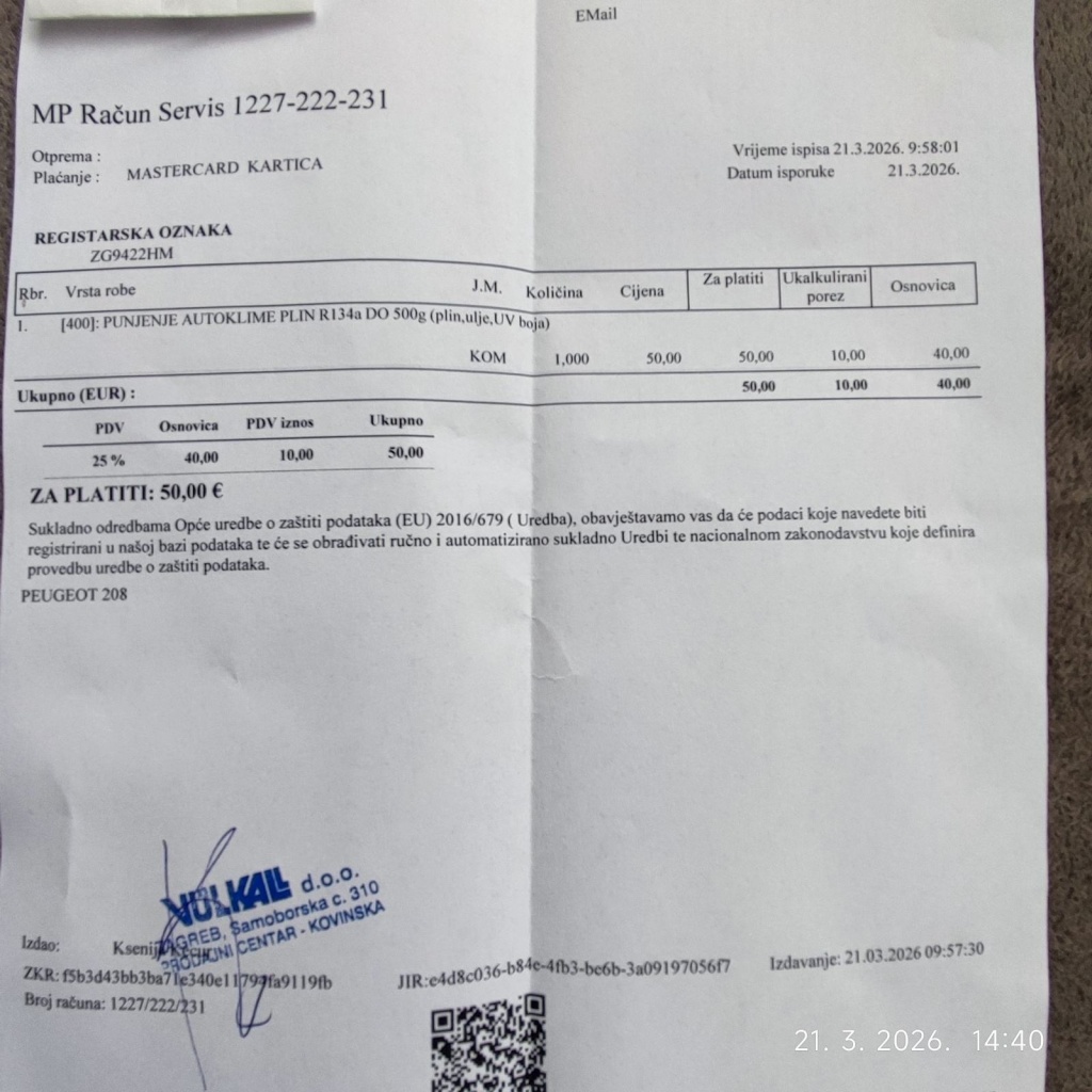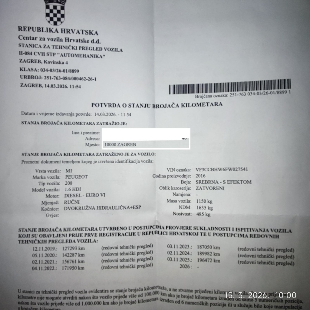 Na 177643 napravljen veliki servis. Na 195480 km promjenjeni prednji ležajevi. Akumulator pod garancijom. Klima servisirana i napunjena. 21.3.2026.
