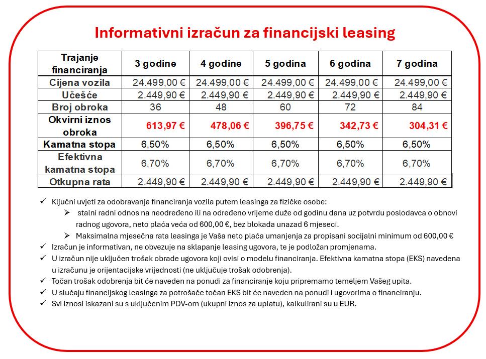 - Leasing (mogućnost leasinga bez učešća) - informativni izračun za predmetno vozilo pogledati u fotografijama