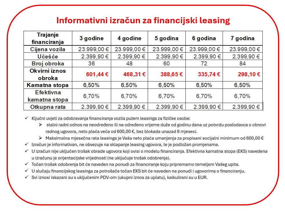 - Leasing (mogućnost leasinga bez učešća) - informativni izračun za predmetno vozilo pogledati u fotografijama